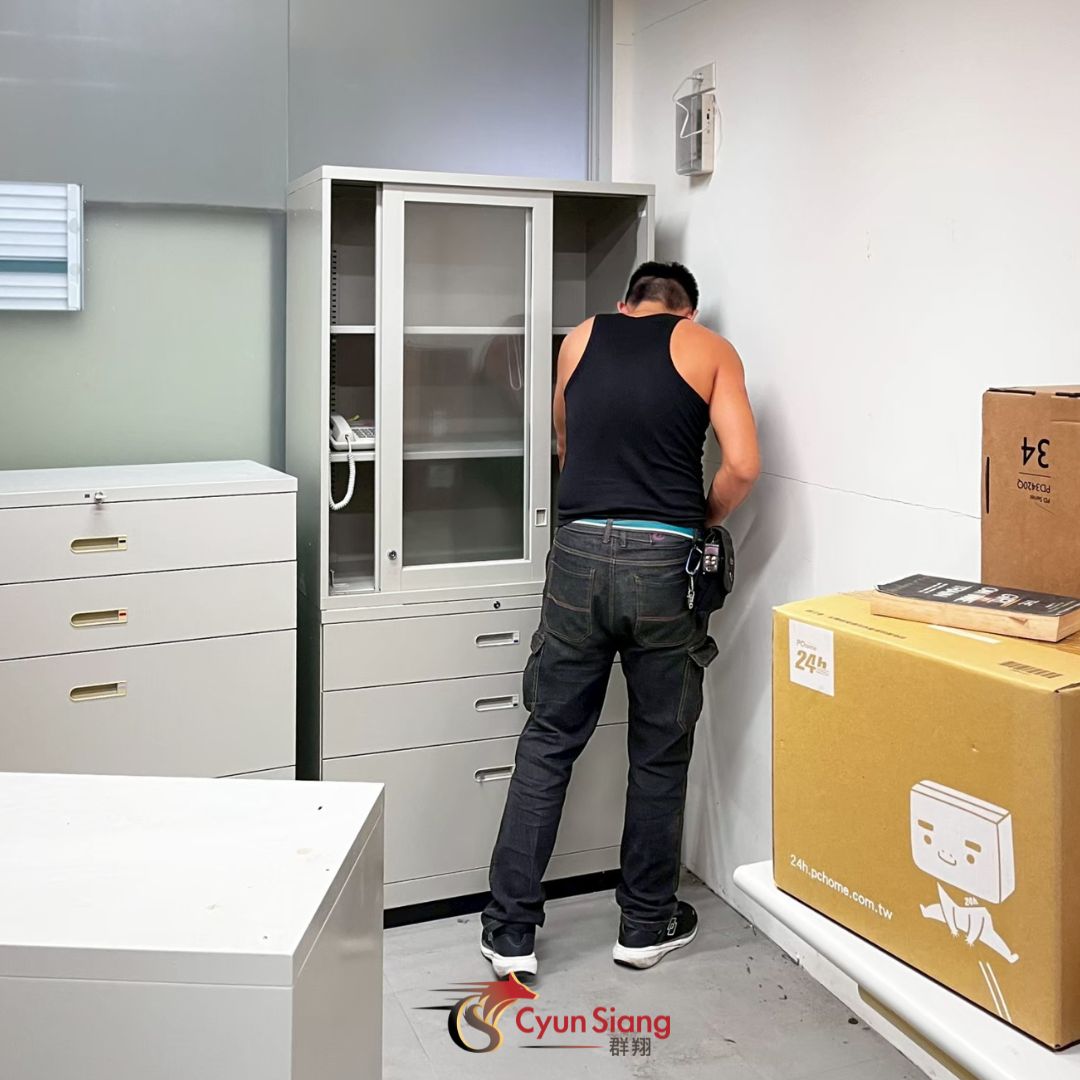 看看進行非常不順利,他們找到我們群翔搬家。我們到場後,先仔細勘查環境:量好走廊寬度、樓梯高度,並確認鐵櫃是否需要部分清空。接著,我們用推車固定住鐵櫃,再配合繩帶綁緊,並由兩名師傅控制重心、另一人負責導向,慢慢通過樓梯口。